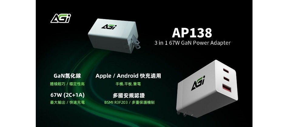 AGI亞奇雷科技近日發表AP138 67W GaN氮化鎵快充充電器,並攜手3C Cool推出EDM38磁吸式外接SSD 讀者體驗徵稿活動,為用戶帶來更便捷的充電與儲存解決方案。