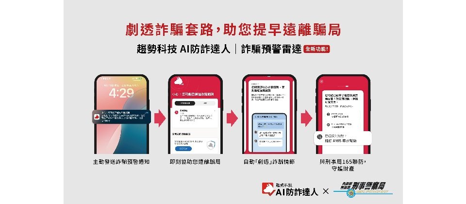 趨勢科技致力於打擊詐騙,除了不斷研發產品創新外,也持續推廣全民防詐意識與認知,並與公部合作,以確保所有年齡層的使用者都能獲得防詐工具和知識,受到保護。除了與刑事局165合作同步防詐資料長達十逾年,近期也啟動「全民防詐守護戰」提供AI防詐達人App三個月免費體驗,更結合最新詐騙預警雷達功能,在用戶步入最終詐騙危機前,提供預警並提醒使用者立即撥打165反詐騙專線協助,真正做到公私協力共同防詐。