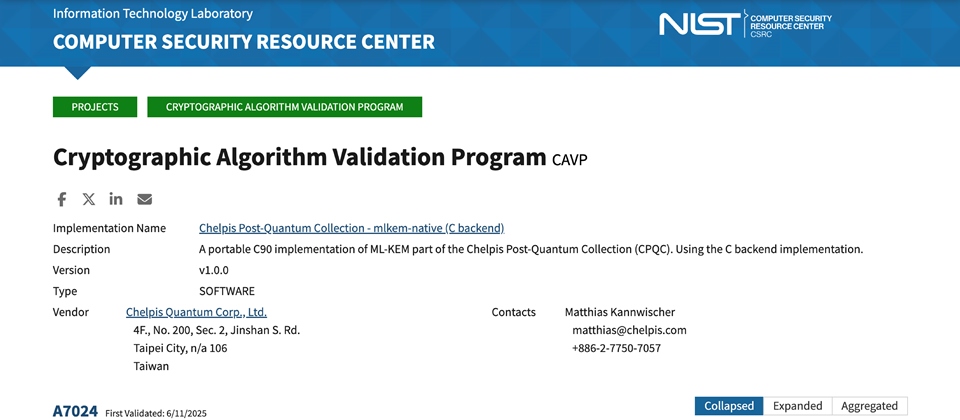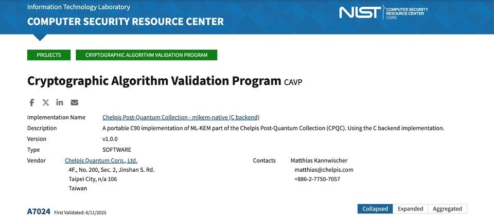 專注於後量子密碼(Post-Quantum Cryptography,PQC)領域的池安量子資安(CHELPIS Quantum Corp., 下稱池安)宣布,自主研發的 PQC 密碼模組正式通過美國國家標準與技術研究院(NIST)密碼演算法驗證計畫(Cryptographic Algorithm Validation Program, CAVP),取得驗證編號#39634。這項成果象徵池安在密碼演算法實作上已達到國際頂尖標準,具備支援政府與企業推動「量子安全遷移」的技術實力。