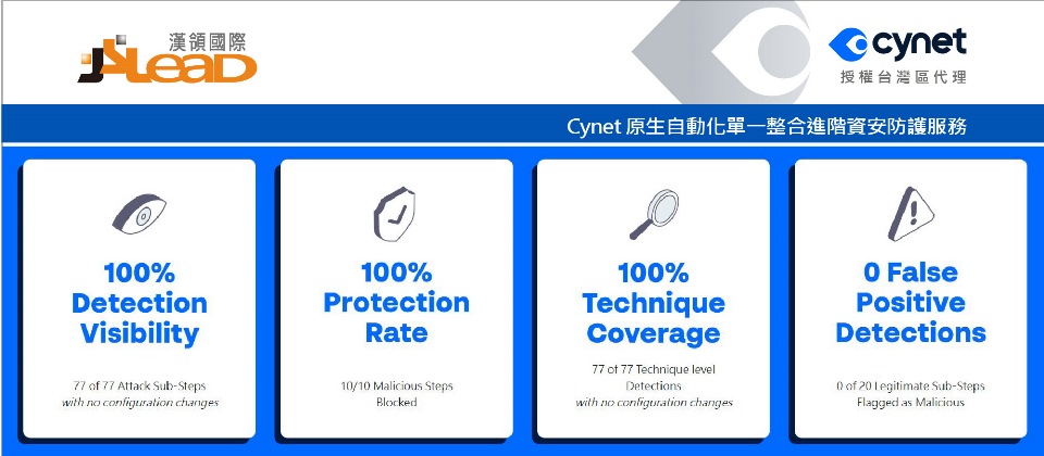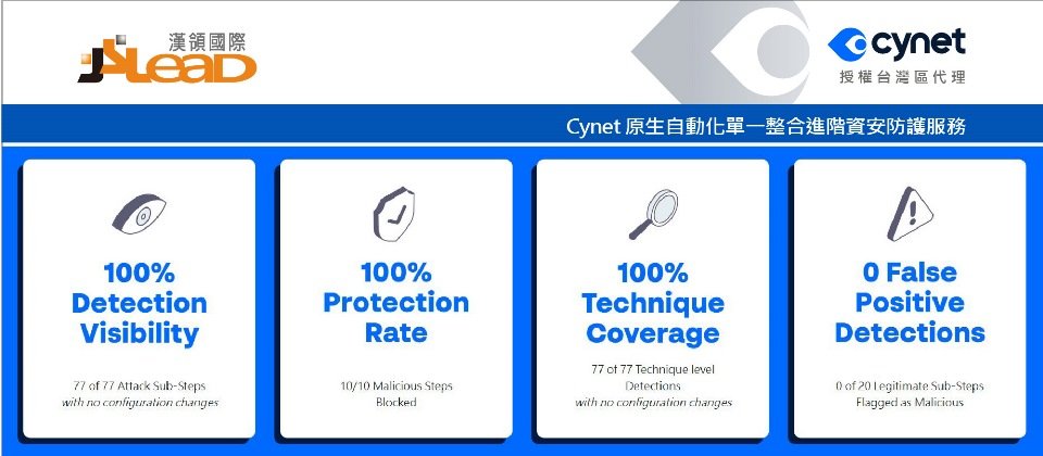 漢領國際宣布正式代理Cynet 原生自動化單一整合進階資安防護服務,Cynet All-in-One 24/7 CyOps Managed Cybersecurity Platform是2024 MITRE ATT&CK評測國際業界唯一以預設配置即達成「100% Protection」與「100% Detection Visibility」兩項關鍵指標的資安服務平台,同時亦獲得「100% Technique Coverage」與「0% False Positive Detections」兩項優異成果,展現領先業界的防護精準度與即時性。