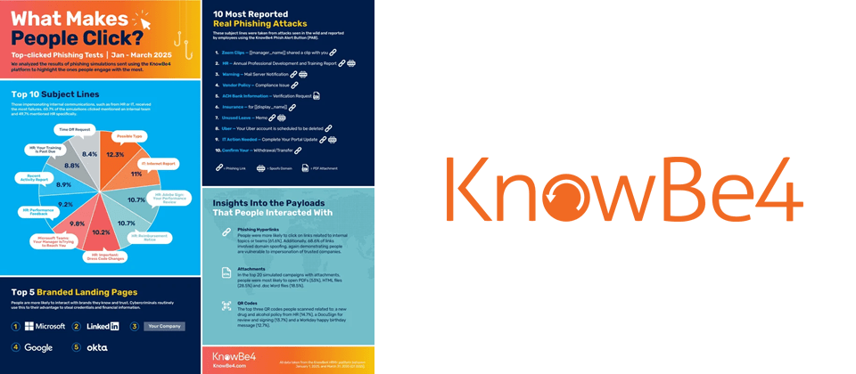 全球領先的人因資安管理平台 KnowBe4於2025 年 4 月 28 日發布 2025 年第一季釣魚報告。報告揭示了用戶在釣魚郵件模擬中最常點擊的欺騙性郵件主題,結果顯示 HR 與 IT 相關郵件占據 60% 以上的點擊比例。(該報告數據來自 KnowBe4 HRM+ 平台,數據期間為 2025 年 1 月 1 日至 2025 年 3 月 31 日。)