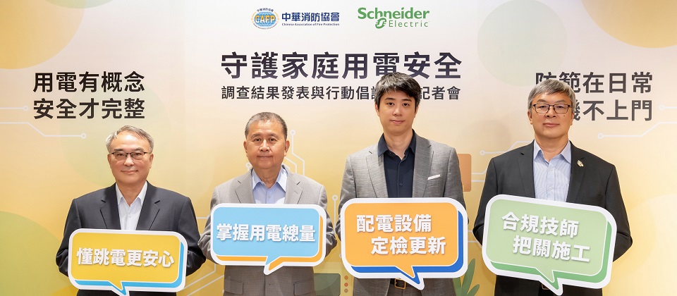 據內政部消防署統計,2022 至 2024 年全台住宅火災起火原因以電氣因素居首位,占比高達 40.1%,遠超過爐火烹調與遺留火種,顯示未曾察覺的用電風險,正是居家安全最容易被忽略的破口。為喚起社會對居家用電安全的重視,中華消防協會攜手施耐德電機發起全台「居家用電安全認知調查」,並舉辦《守護家庭用電安全:調查結果發表與行動倡議啟動記者會》。活動由中華消防協會專業講師、施耐德電機代表與具實務經驗的電機技師共同參與,針對調查中揭示的認知落差,從家庭用電習慣、常見誤區到安全觀念缺口,提出具體建議,呼籲全民正視潛藏風險,將安全意識真正融入日常生活。