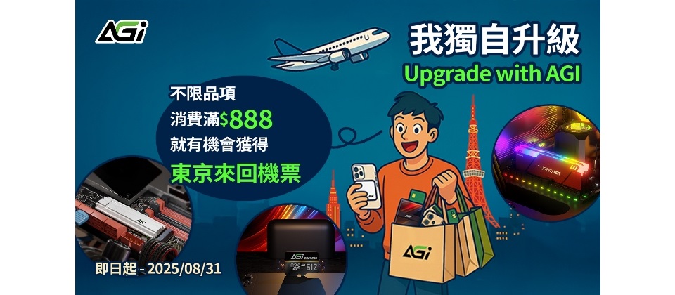 台灣記憶體品牌 AGI(亞奇雷科技)今夏推出限時活動「我獨自升級 Upgrade with AGI」,鼓勵消費者升級儲存設備、備份創作與生活資料。即日起至 2025 年 8 月 31 日止,凡購買 AGI 商品,不限通路,單筆消費滿 NT$888(不含運費),完成發票登錄即可參加抽獎。最大獎為東京來回機票,更多豐富好禮等你帶回家。