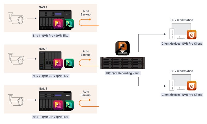 QVR Recording Vault 備份伺服器與端點的 QVR Pro 或 QVR Elite 監控伺服器連線後,即自動備份多端點的錄影檔案
