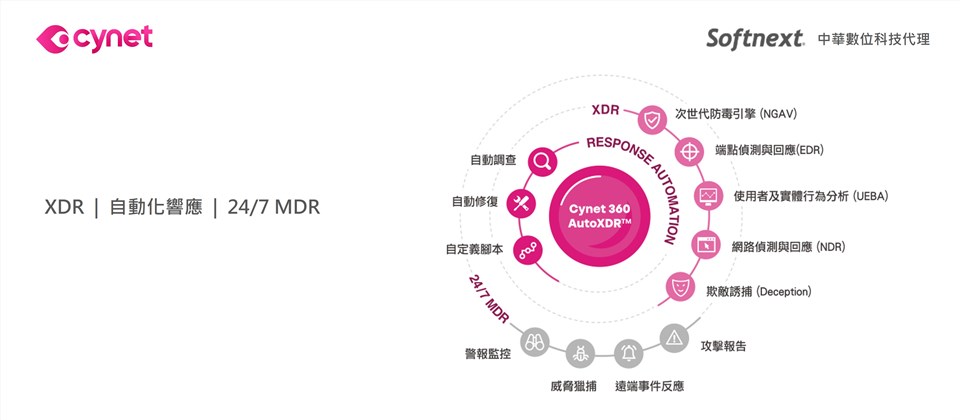 Softnext 中華數位科技為 Cynet 亞太地區第一家代理商。有鑑於網路威脅日趨複雜,為提供企業更完善的資安防禦解決方案,除了強化自主研發產品的防禦能力,亦代理國際資安大廠的專業防護產品,從各個重點缺口著手防禦,以多元的防禦解決方案,協助企業打造更完備的防禦環境,降低資安風險。