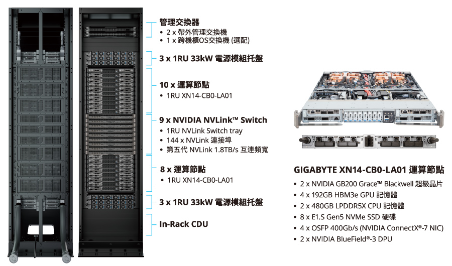 - 整合 36 個 NVIDIA Grace CPU 與 72 個 Blackwell GPU