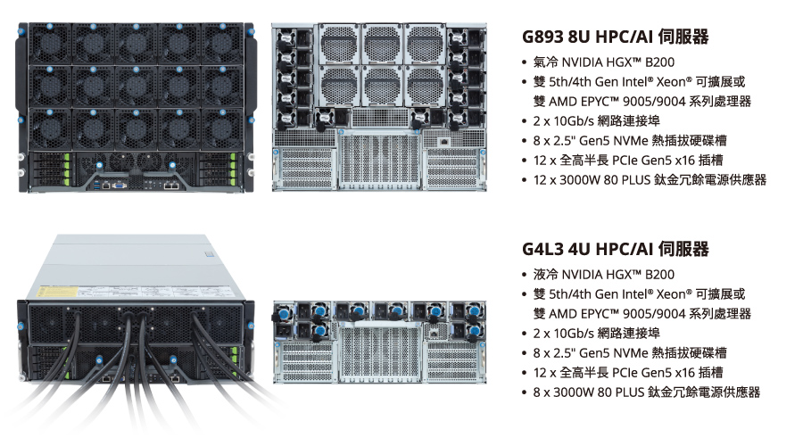 - G894 / G893 系列 (8U):支援 Intel Xeon 6 或 AMD EPYC™ 9005/9004,搭載 NVIDIA HGX™ B200 8-GPU,專為大規模 AI 訓練設計。
