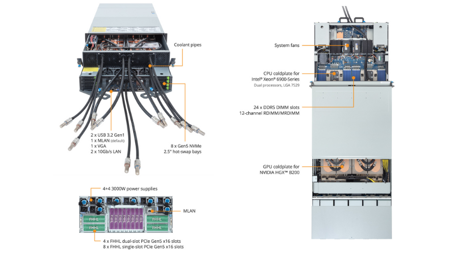 CPU 與 GPU 皆採用直接液冷設計,搭配漏液檢測,有效降低熱能瓶頸並強化系統可靠度。 -