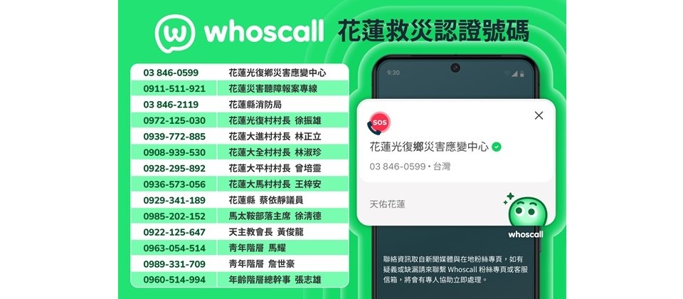 花蓮馬太鞍溪堰塞湖溢流重創花蓮,光復鄉、鳳林鎮、萬榮鄉災情慘重,國民防詐 App Whoscall 即日起將花蓮當地救災相關單位聯絡電話全數納入《認證號碼》服務。首次將原本作為防範冒名電話、保護品牌商譽的《認證號碼》服務投入於救災通訊工作中,協助提升當地災民援助與物資協調作業的通訊效率。