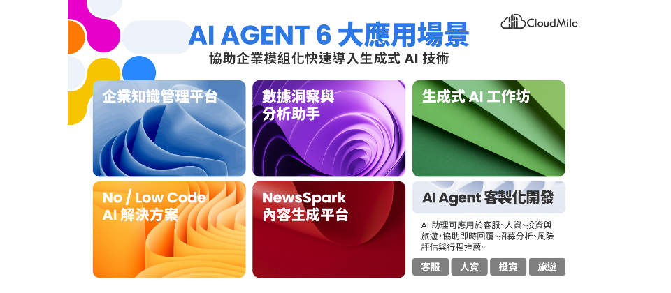 在此次論壇中,也展示六大 AI Agent 應用場景,從企業知識管理、數據分析助手到內容生成與客製化 Agent 開發,協助企業快速導入生成式 AI 技術。隨著企業逐步將 AI 導入營運核心,六大應用場景將成為推動營收成長與營運效率提升的關鍵引擎。