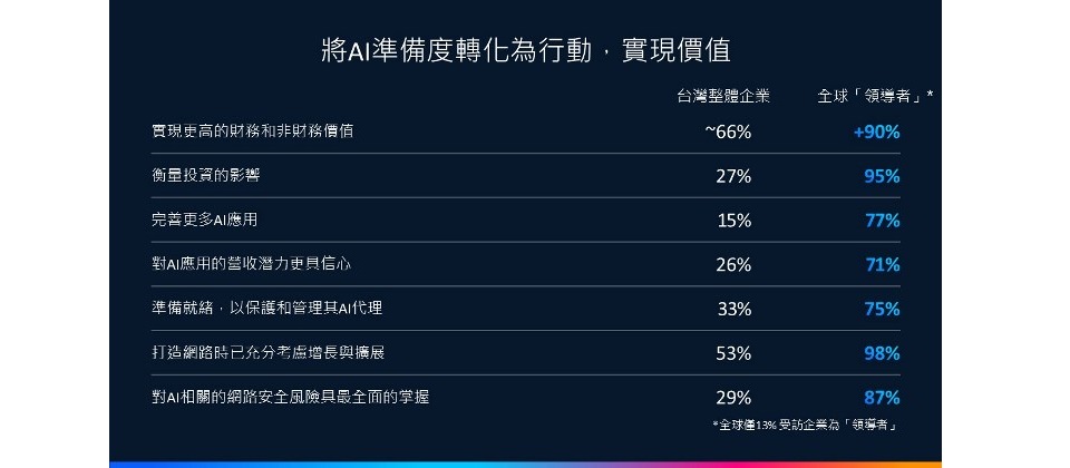 全球「領導者」的持續優勢展現出一種嶄新韌性:透過嚴謹、系統化的方式,平衡策略推動力與AI加速發展所需的數據和架構。他們更著眼於未來,全球有高達98%「領導者」在打造網路架構時已充分考慮AI的增長、規模與複雜度,而僅有53% 台灣企業有同樣規劃,凸顯台灣企業在架構準備度方面與全球「領導者」之間存在明顯差距。