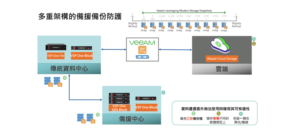 雲端備援層:HCP 作為雲端物件儲存層,提供版本與不可變備份。