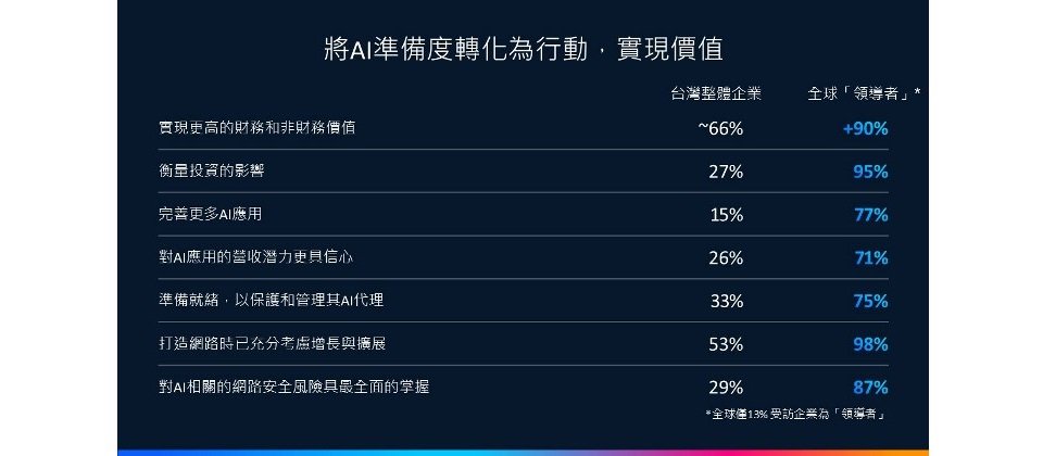 全球「領導者」的持續優勢展現出一種嶄新韌性:透過嚴謹、系統化的方式,平衡策略推動力與AI加速發展所需的數據和架構。他們更著眼於未來,全球有高達98%「領導者」在打造網路架構時已充分考慮AI的增長、規模與複雜度,而僅有53% 台灣企業有同樣規劃,凸顯台灣企業在架構準備度方面與全球「領導者」之間存在明顯差距。