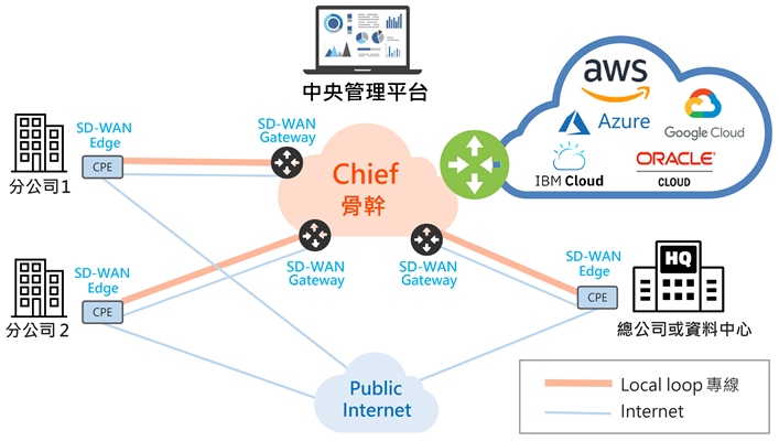 依需規劃:能依照需求和預算,提供各電信公司、各類型的電路及網際網路服務作為SD-WAN連線的選擇,整合成極具彈性的解決方案。