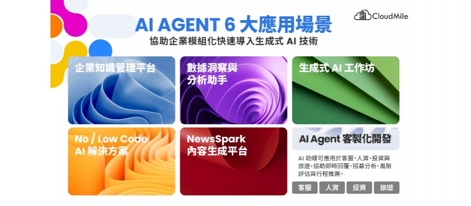 CloudMile 萬里雲也以「人才、技術、流程」的黃金三角為核心,打造完整 AI 能量體系。集團旗下擁有超過 60 位 全球 AI、數據與資安專家,累積超過 400 張技術專業認證與超過 1400 家企業的實務導入經驗,並推出六大 AI Agent 應用場景,涵蓋:
