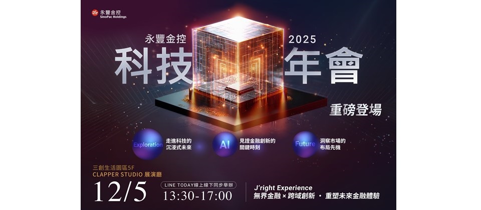 「永豐金控科技年會」將在12月5日於三創生活園區5F CLAPPER STUDIO展演廳盛大登場,以LINE TODAY線上線下同步舉辦。即日起開放活動報名,凡線上報名成功,即可獲得永豐金證券股票禮品卡抽獎資格;線上報名成功,並全程觀看直播及填寫會後問卷,還有機會獲得iPhone 17及AirPods Pro 3等科技好禮;現場參與並完成產品體驗,還可獲得多項專屬禮品。歡迎所有關注科技趨勢、IT及AI技術人員,與產官學各界先進共襄盛舉,一同探究AI金融科技的趨勢與技術應用。活動詳情請見永豐金控科技年會活動網站:https://reurl.cc/Ebzj21