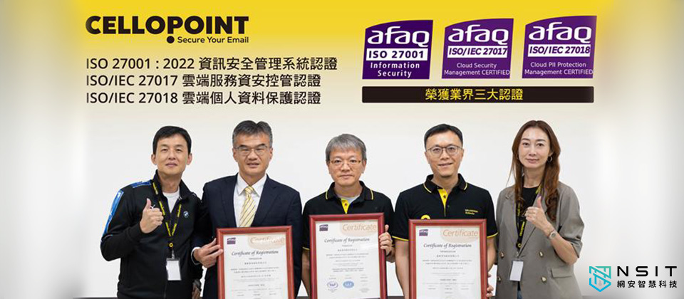 全球知名的電子郵件與協作安全解決方案提供商 Cellopoint(基點資訊股份有限公司) 自 2024 年通過國際級資安標準 ISO/IEC 27001 驗證後,Cellopoint再度取得突破。並且近日宣布,其「安全協作之軟體開發平台及資訊基礎設施運維」已順利通過 ISO/IEC 27017(雲端服務資安控管) 與 ISO/IEC 27018(雲端個人資料保護) 國際指引的第三方驗證。此一成就,不僅彰顯Cellopoint對於資安治理與個資保護的高度重視,也再次印證其長期以來致力於打造安全可信雲端環境的決心。
