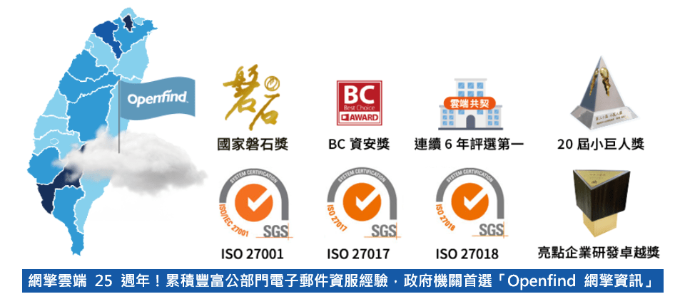 Openfind 成立於 1998 年 1 月,長期致力於軟體產品與雲端服務自主研發,為政府機關、企業用戶與廣大網友提供高品質、高穩定與高擴充性的軟體與雲端服務。除了立足台灣市場外,Openfind 成功開拓日本市場、東南亞與新興市場,並以外銷成果卓著獲得第 20 屆小巨人獎肯定。從企業電子郵件系統出發,到郵件安全防護、稽核、歸檔系統,以及檔案安全分享平台,Openfind 堅守「創新技術與優質服務」的企業文化,提供兼顧資訊安全與成本效益的解決方案,除各項產品皆獲得台灣精品獎肯定外,2024 年更榮獲國家磐石獎取得中小企業最高榮耀。更多訊息,請瀏覽公司網站