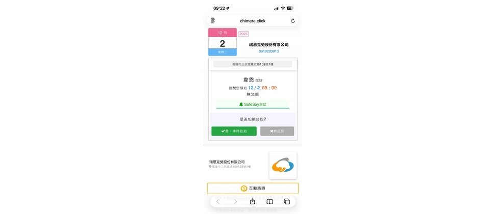 瑞恩克勞「奇美菈」智慧預約系統,長期以來協助診所透過簡單操作即可完成線上預約、約診管理與掛號服務。此次導入 SafeSay 平台後,系統功能獲得全面升級,整合了簡訊提醒、即時通訊、以及聊天室互動等多重功能。
