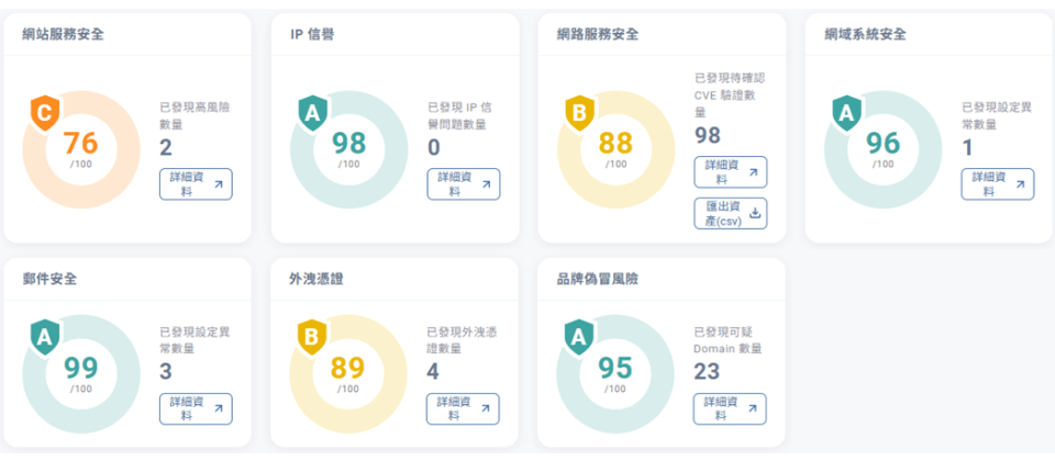 本次行動利用中華資安國際研發之「資安眼 HorusEyes 資安曝險評級服務」,從「駭客視角」用外對內Outside-In、非侵入式方式,導入AI與紅隊技術進行資通訊資產探勘,找出公司或機構在網際網路上的網站、系統、網路設備與雲端服務等,從七大關鍵維度進行深度剖析,包括網站安全、IP信譽、網路服務安全、網域安全、郵件安全、暗網外洩憑證、可疑偽冒網域等,協助社福團體快速檢視對外曝險態勢,並降低外部遭受攻擊的介面(external attack surface)。此外,資安眼部署於國內中華電信機房,檢測涵蓋最完整,還更能確保資料的留存與保護無虞。