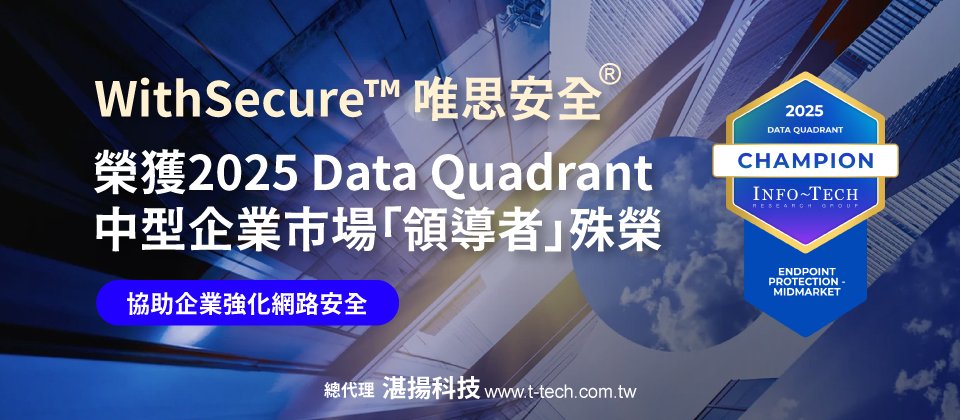 WithSecure™唯思安全®台灣總代理湛揚科技提供WithSecure Elements整合式模組化雲端資安解決方案,涵蓋本次獲獎的端點防護(EPP)、端點偵測與回應(EDR)和曝險管理(XM)等專業技術,協助合作夥伴建置可延展、易管理,且具前瞻性的資安架構,從容「超前部屬」快速演進的網路威脅。湛揚科技同步推出「EPP+EDR升級套餐」獨家優惠,並提供最新雲端安全產品的試用申請服務,協助企業快速、便利地導入進階資安防護。更多資訊歡迎造訪湛揚科技官網https://www.t-tech.com.tw或洽詢服務專線02-2515-1585,湛揚資安團隊將提供完善的資安建議與導入規劃。