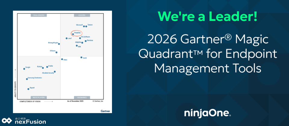 面對日益複雜的混合辦公環境與層出不窮的資安威脅,台灣企業的IT管理人員正處於管理負擔過載的臨界點。全球IT維運管理領導廠商ninjaOne於近日寫下歷史新頁,正式獲選為2026年Gartner®端點管理工具魔力象限(Gartner Magic Quadrant for Endpoint Management Tools)的領導者。作為ninjaOne在台灣的核心合作夥伴,盛合網路(nexFusion)將以此殊榮為動力,協助台灣在地企業,導入自主化技術,讓IT維運體質全面最佳化。