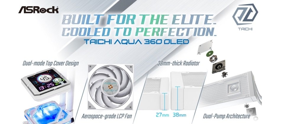Taichi AQUA系列承襲其獨特的設計語彙,完整展現華擎對散熱與設計質感的極致詮釋。創新的雙模式上蓋設計,讓使用者可依需求自由切換 3.4 吋全彩顯示螢幕,或即時呈現冷卻液流動狀態的透明水道頂蓋,兼顧實用機能與科技美學。針對極高散熱需求而打造,Taichi AQUA 360 LCD 採用可支援 500W 以上 TDP 的雙泵架構,並搭配38mm 厚高容量冷排與內建流量指示設計,為高負載運作提供更直覺且可靠的運行保障。導入航太級LCP冷排風扇、工業級雙滾珠軸承與IP54等級防塵防水防護,兼顧效能表現與長期耐用性,展現 Taichi 系列作為華擎旗艦 AIO 的全新高度。