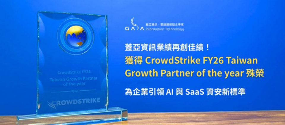 雲端資安領導廠商蓋亞資訊,憑藉過去一年在台灣市場的強勁增長與卓越的技術服務實力,榮獲全球資安權威 CrowdStrike 頒發的 「FY26 Taiwan Growth Partner of the Year」 (年度最佳成長合作夥伴)獎項。此殊榮不僅肯定了蓋亞資訊在業務實踐上的跳躍式成長,更彰顯其作為 CrowdStrike 核心戰略夥伴,協助台灣企業抵禦數位威脅的卓越貢獻。