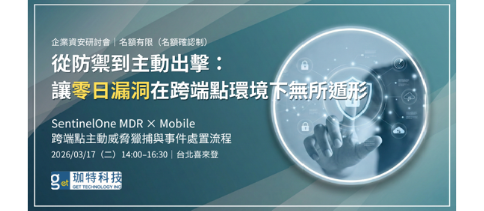 珈特科技將於 2026 年 3 月 17 日在台北舉辦研討會,聚焦 SentinelOne MDR × Mobile 的跨端點防護實務,以及 SentinelOne × Jamf 的整合應用,陪企業團隊從偵測、追查到回應,把整套流程走一遍。