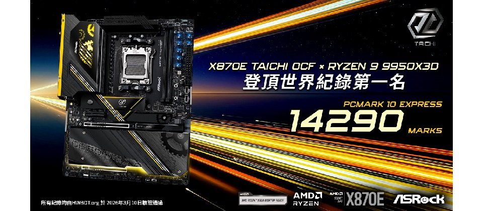 全球知名主機板、顯示卡、迷你電腦、電競顯示器、電源供應器與一體式水冷散熱器製造商華擎科技 (ASRock Inc.) 宣布,其旗艦級超頻主機板X870E Taichi OCF再次締造卓越成績,在全球超頻排行榜HWBOT.org上成功奪下PCMark 10 Express 世界紀錄第一名。