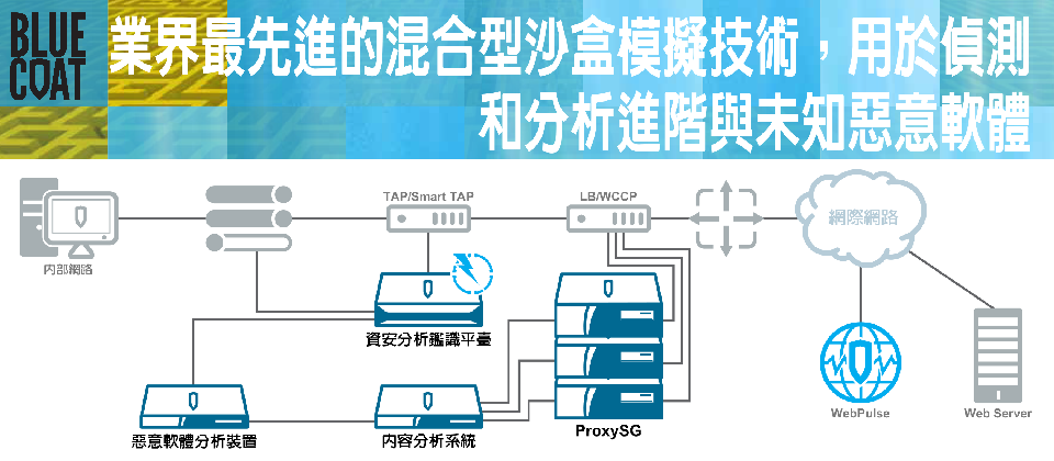 Blue Coat 內容分析系統屬於資安與政策實施中心的組成部分,是一個為您提供未知、已知以及目標式攻擊之最佳防護的分層平臺。於 Web 閘道獲得絕佳進階惡意軟體防護方案內容分析系統與 Blue Coat ProxySG 全系列緊密結合,採用頂尖的分層方法來防禦已知及未知危險,並具備防毒技術、白名單以及搭配惡意程式動態分析(沙盒模擬)系統。這兩種產品的結合針對當下市場中的目標式攻擊(APT)提供了最大程度的惡意軟體防禦。 配合使用內容分析系統和 ProxySG 可帶來更出色的效能和延伸能力,讓您免於遭受病毒、特洛伊木馬病毒、蠕蟲、間諜軟體及其他形式的惡意內容威脅,即使使用者沒有在桌面執行防毒軟體時也可提供保護。