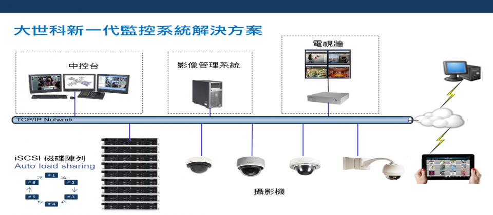 傳統監視系統的錄影都要先透過一台伺服器處理過後,再將影像儲存到後端的儲存設備,不僅要投資錄影伺服器、作業系統、防毒軟體、機櫃、軟體授權費…等成本,也大幅增加日後維護工作的困難度。大同世界科技(簡稱:大世科)提供的新一代網路監視系統,不但可以把攝影機的視訊影像直接儲存到指定的磁碟陣列中,所有在攝影機的設定,也可以直接連結到雲端的儲存設備,不會受到影像壓縮而影響品質,系統更會自動引導磁碟陣列中的硬碟互為備援;此新一代網路監視系統相較於一般磁碟陣列必須另外買一套設備做備援,新系統更加善用儲存空間,例如,當某一顆硬碟壞掉時,系統會把這顆硬碟原本錄製影像的攝影機,轉錄到磁碟陣列其它仍有儲存空間的磁碟中,發揮磁碟陣列的雲端功能,也傳達了「影像虛擬儲存層」的概念。