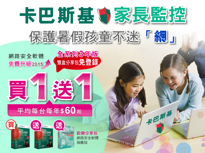根據教育部eteacher網站的調查,孩子暑假期間,每日使用網路的時間平均高達4小時,週末假日更高;隨著年級越高,使用網路時間也會越長。網路上暗藏各式威脅,包括各式病毒、不良資訊以及網路詐騙,都可能使您的孩童與家庭面臨威脅的侵害。全球領先的資訊安全供應商 - 卡巴斯基網路安全軟體全系列提供「家長監控」防護功能,隨時留意孩童瀏覽網頁、收發電子郵件、下載檔案、使用社群網站等上網安全,輕鬆管理電腦使用與上網時間,建立安全無虞的網路環境。暑假期間特別推出指定商品同品項「買一送一」優惠活動;買再送泰騰恩隨身硬碟防護軟體,還有機會獲得暑期壓軸強檔電影《記憶傳承人:極樂謊言》電影雙人特映券,好禮拿不完,千萬不要錯過!