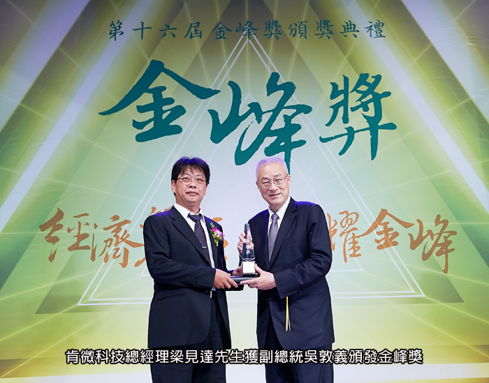 擔任台灣企業交流平台的中華民國傑出企業管理人協會,於26日在中油大樓國光會議廳舉行「第十六屆金峰獎」頒獎典禮,肯微科技從500多家報名企業中,分別以優良的經營績效和熱插拔不斷電模組產品,獲頒「傑出企業」、「創新研發」雙料殊榮,並由總經理梁見達先生從副總統吳敦義手中接下獎牌。