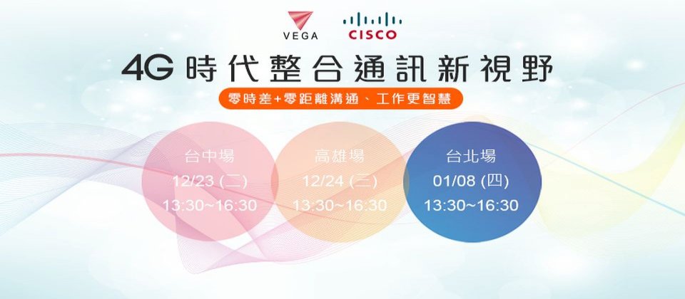 為了讓客戶掌握最新的整合通訊技術,維嘉全球2015年1月8日下午13:30在台北民生東路三段128號10F的新辦公室,將與台灣思科合辦一場「4G時代整合通訊新視野」研討會,深入探討4G時代,在高速移動、多點佈署、更快速的行動應用服務趨勢下,如何整合各式視訊平台與裝置,或是透過軟體的協同合作溝通,建立零時差、零距離的溝通環境,實現整合通訊的劃時代壯舉。現在立即報名,就有機會抽中「Cisco WebEX一年租用帳號五折優惠券」!