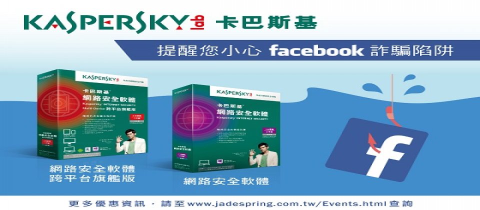 網路罪犯利用人們對Facebook的信任發動釣魚攻擊,卡巴斯基為保護您的資訊安全,特別推出凡購買卡巴斯基網路安全軟體2015全系列即享同品項「買一送一」限時特惠活動;隨貨再送網路安全軟體for Android一台一年版(市價490元),提供智慧型手機與平板電腦全方位隱私與竊盜防護。即日起至6月30日止,購買網路安全軟體跨平台旗艦版,上網登錄再送300元7-11禮券,提供電腦、Mac、Android手機及平板電腦全方位安全防護;購買網路安全軟體上網登錄再送「泰騰恩安全特盤」(市價890元),內建卡巴斯基強大的掃描核心,兼具病毒掃描、資料及私密文件保護等諸多功能合為一體的防毒隨身碟。卡巴斯基全面對抗現今新興網路的各式威脅,全方位的網路安全防護一次到位,時時刻刻提供最切合需要的防護,全系列產品於燦坤、順發、三井、全國電子等3C連鎖通路及全台經銷門市、卡巴斯基官方網站、PChome與Yahoo線上購物熱烈銷售中!更多優惠訊息,請參閱卡巴斯基個人版總代理泉琨科技官方網站http://www.jadespring.com.tw/Events.html。卡巴斯基想你所想,以你為先,守護您的個人隱私資訊,暢遊網路最安心!