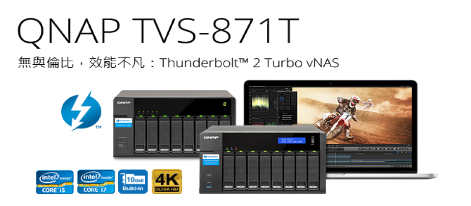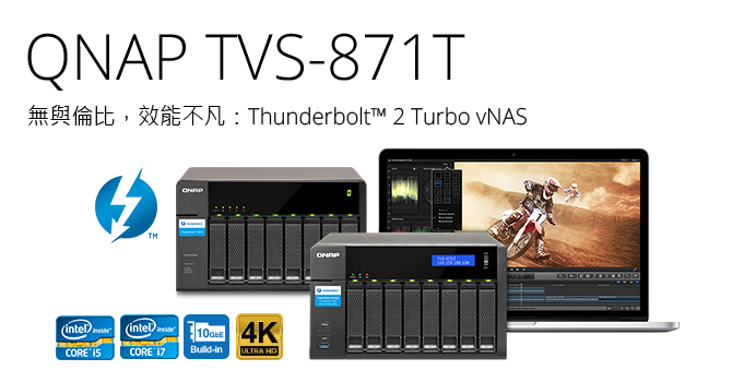 台灣,台北,2015 年 8 月 25 日 - 威聯通®科技 (QNAP® Systems, Inc.) 今日發表世界第一台 Thunderbolt™ 2 Turbo vNAS TVS-871T,擁有第二代 Thunderbolt 高達 20 Gb/s 的大頻寬,可流暢傳輸 4K 影像,同時支援新款 Thunderbolt 儲存擴充設備 TX-500P 與 TX-800P。TVS-871T 融合了 DAS 高速儲存及 NAS 便利分享的優點,提供創意媒體工作者彈性、有效率的儲存解決方案,滿足龐大 4K 影像傳輸需求、有效加速工作流程。