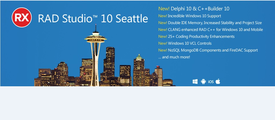 RAD Studio 10 Seattle能讓您更容易的建立新的Windows 10應用程式,無論是大量資料處理, 即時互聯網路的應用或是應用程式整體的魅力提升上,都能協助您達成。同時也能快速地更經濟的延伸Windows 10解決方案到OS X, 行動裝置及物聯網應用。新的Windows 10 VCL Controls, Styles, 及Universal Windows Platform服務元件,使得VCL及FMX應用程式,能夠快速且更容易地升級到Windows 10系統。還有比以往加倍大的專案開發, 支援多螢幕功能, 及程式碼檢查功能。RAD Studio 10 Seattle能讓程式設計師在開發跨平台, 雲端, 資料庫應用程式的效率提高5倍,包括32位元及64位元的Windows 10應用程式。