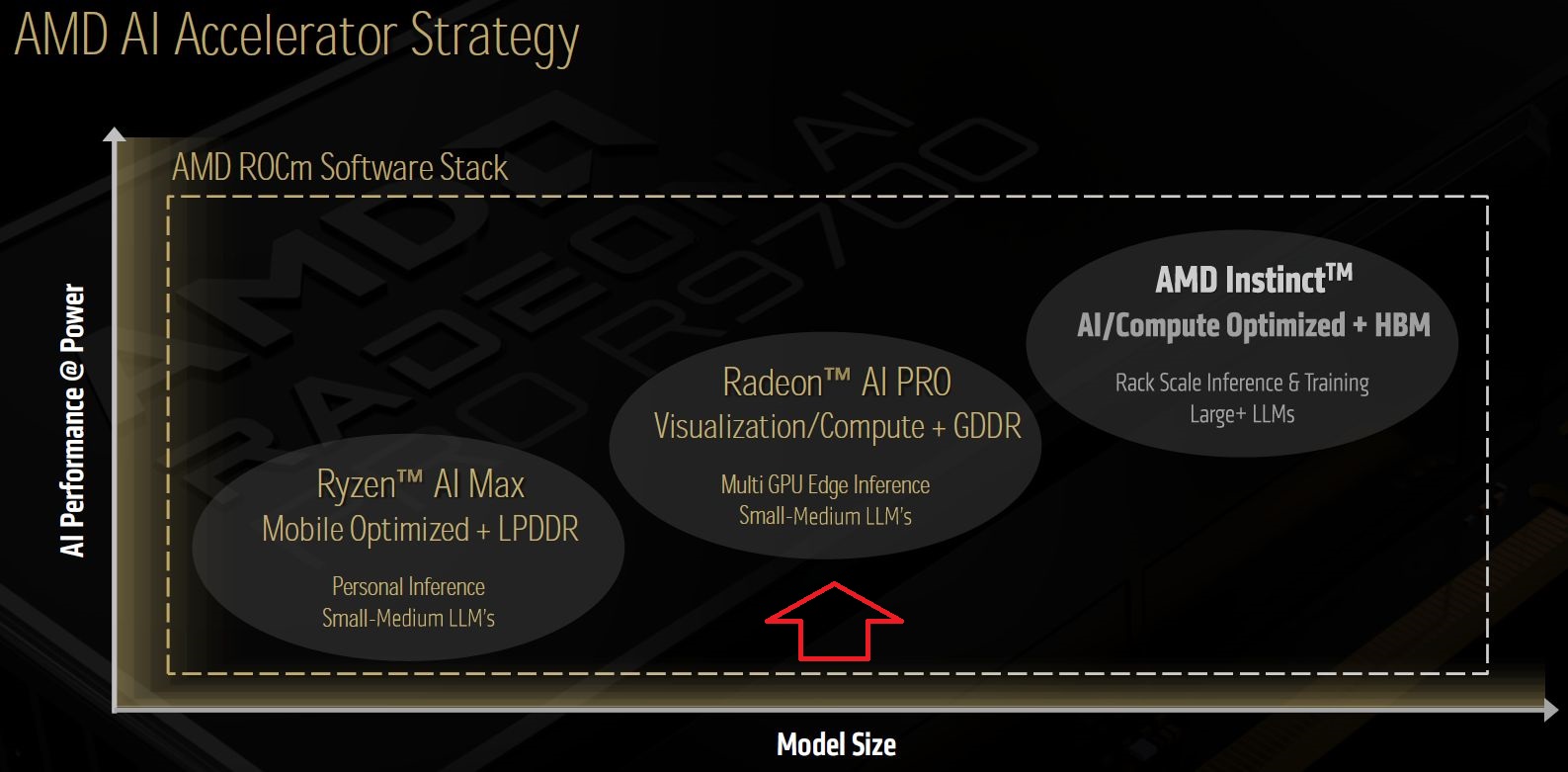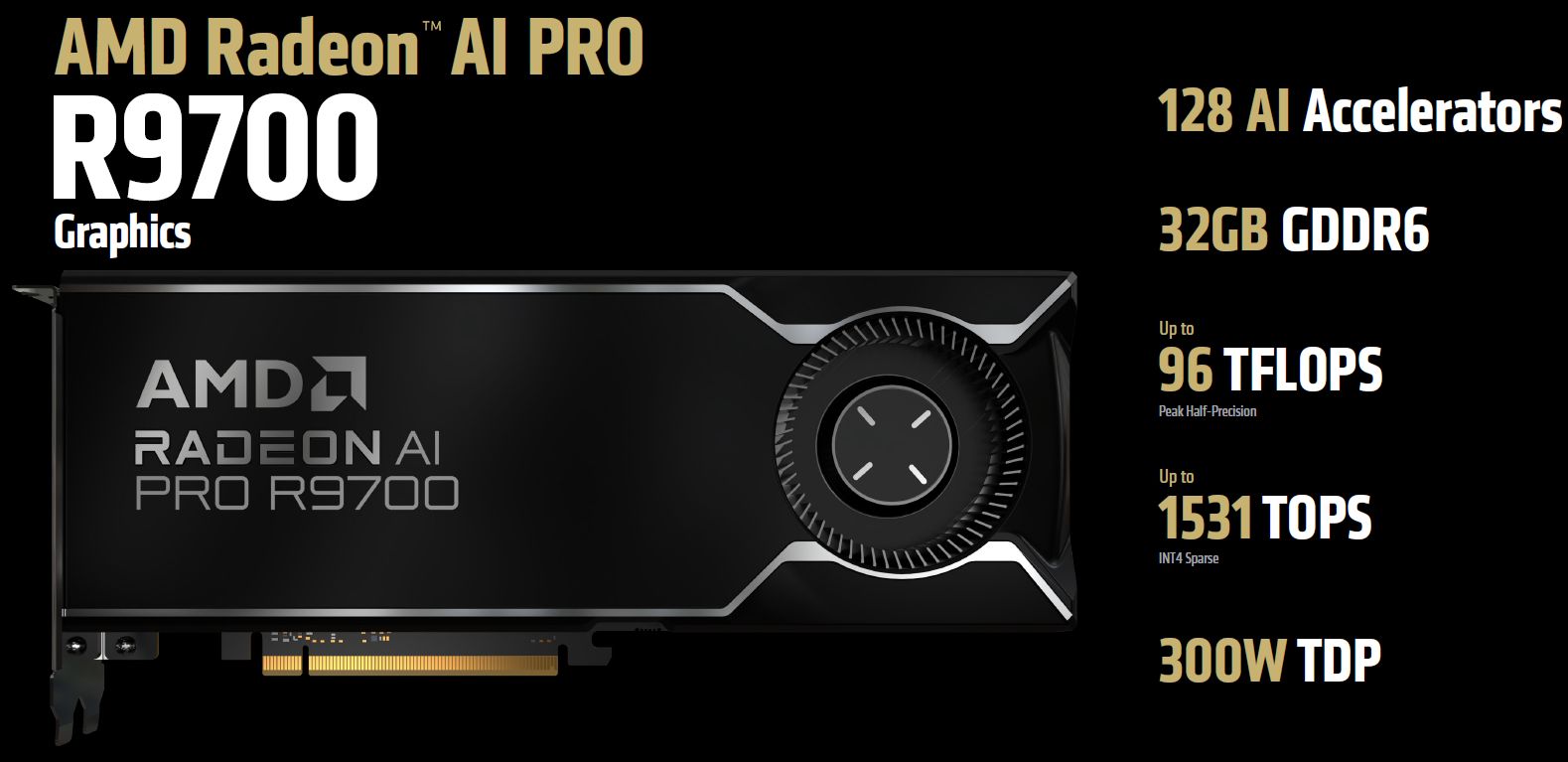 兩年多前,AMD推出採用RDNA 3架構、內建AI加速器的專業繪圖處理器,名為Radeon Pro W7000系列。今年5月台北國際電腦展期間,AMD發表新一代專業繪圖處理器,名為Radeon AI Pro R9000系列,採用RDNA 4架構、第二代AI加速器,也支援PCIe 5.0介面,這批產品線預計7月上市的首款機型R9700,預計有7個廠商推出,包含華擎(ASRock)、華碩、技嘉、Power Color、Sapphire、XFX、盈通(Yeston),在硬體規格方面,將配備32 GB容量的GDDR6記憶體,是專為單機系統AI推論、模型微調、複雜的創意工作負載,以及其他資料密集型工作流程等用途而設計的產品。