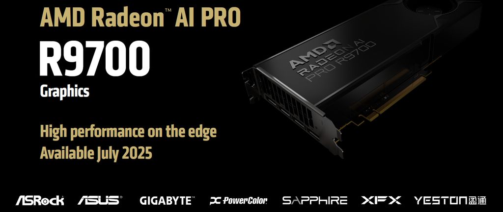 到了7月下半,AMD宣布多家廠商的工作站系統將搭配Radeon AI Pro R9700,23日開始販售,但他們並未揭露廠商品牌,預計第三季將由板卡(AIB)合作廠商推出獨立GPU加速卡產品。