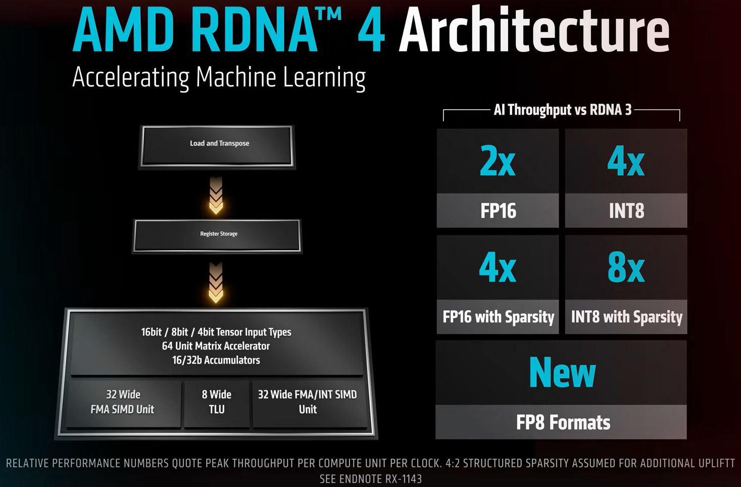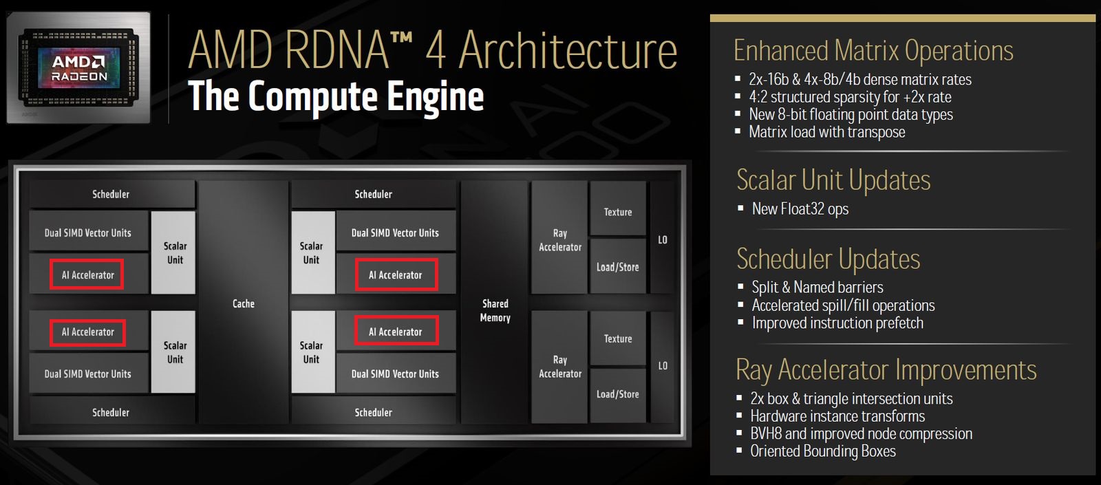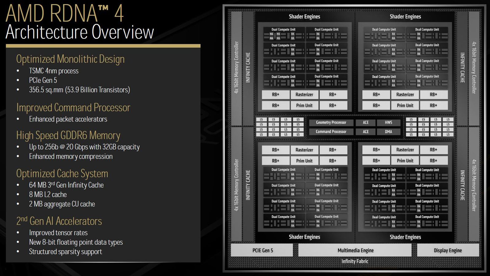而在運算相關規格方面,AMD強調R9700內建64個運算單元、128個第二代AI加速器,支援的資料型別涵蓋FP16、FP32、INT8、INT4,也因為導入RDNA 4架構而能處理FP8。而在RDNA 4架構的部分,他們也透露更多資訊,像是導入台積電4奈米製程、電晶體數量高達539億個。
