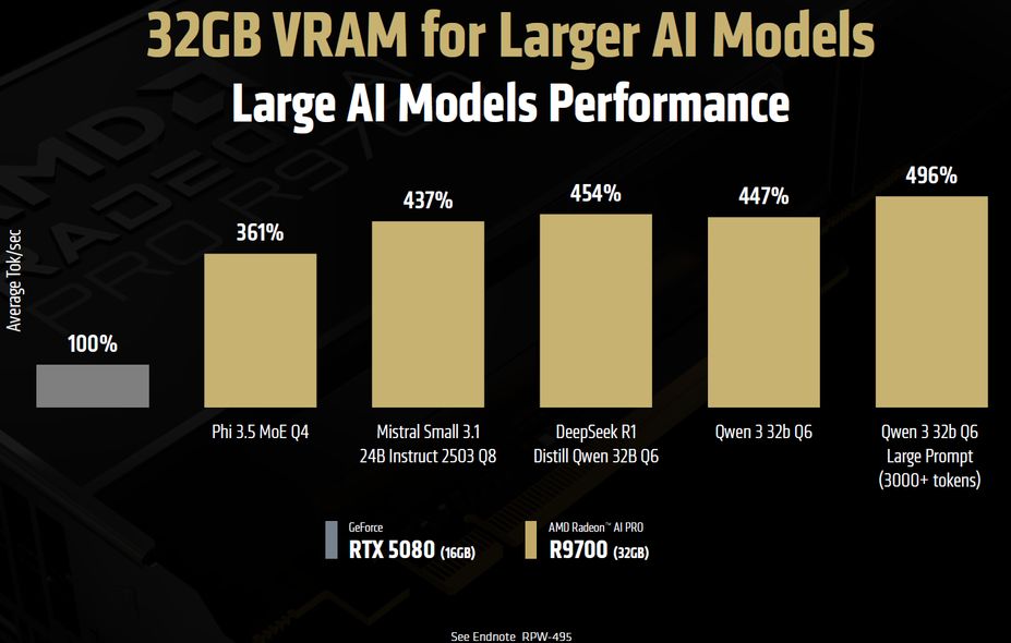 由於R9700配備的GPU記憶體容量高達32 GB,AMD表示,能將整個AI模型執行在GPU記憶體當中,可用於應付大量詞元處理的大型語言模型提示,以及需要微調指令的模型,相較於配備16 GB記憶體的GPU,可提供5倍的效能。
