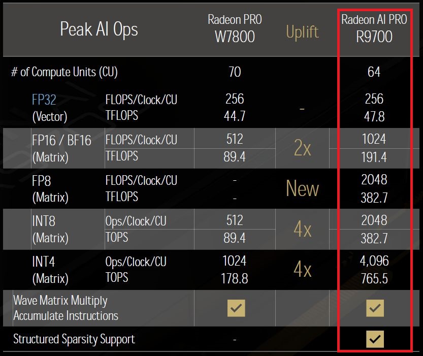 關於AMD兩代專業繪圖處理器運算效能規格的差異,AMD將Radeon AI Pro R9700對比的既有產品,是Radeon Pro W7000系列的中高階款式W7800,應該意味著兩者的位階相近,例如,以運算單元的數量而言,R9700有64個,W7800有70個;在FP32向量運算的項目上,R9700效能為47.8 TFLOPS,W7800效能為44.7 TFLOPS。