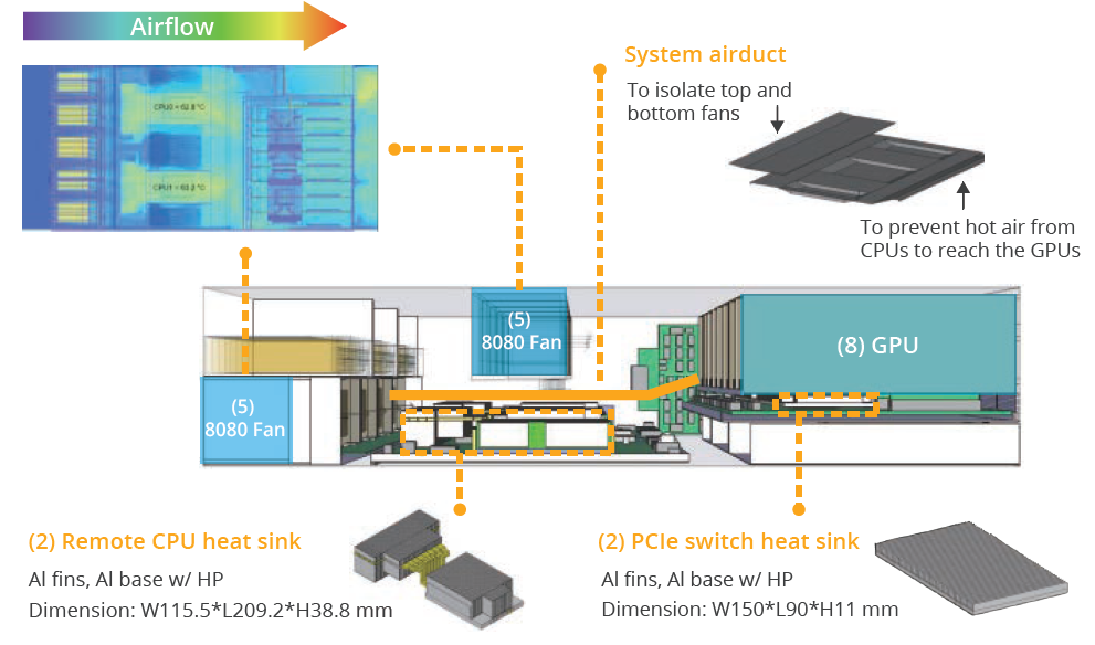 而且,針對CPU、GPU、PCIe Switch機板這三個發熱的元件,以及CPU遠程散熱座、散熱片、風扇、通風導管(airduct)等氣冷配置,雲達也特地以圖解方式呈現他們實作的散熱效率提升設計。