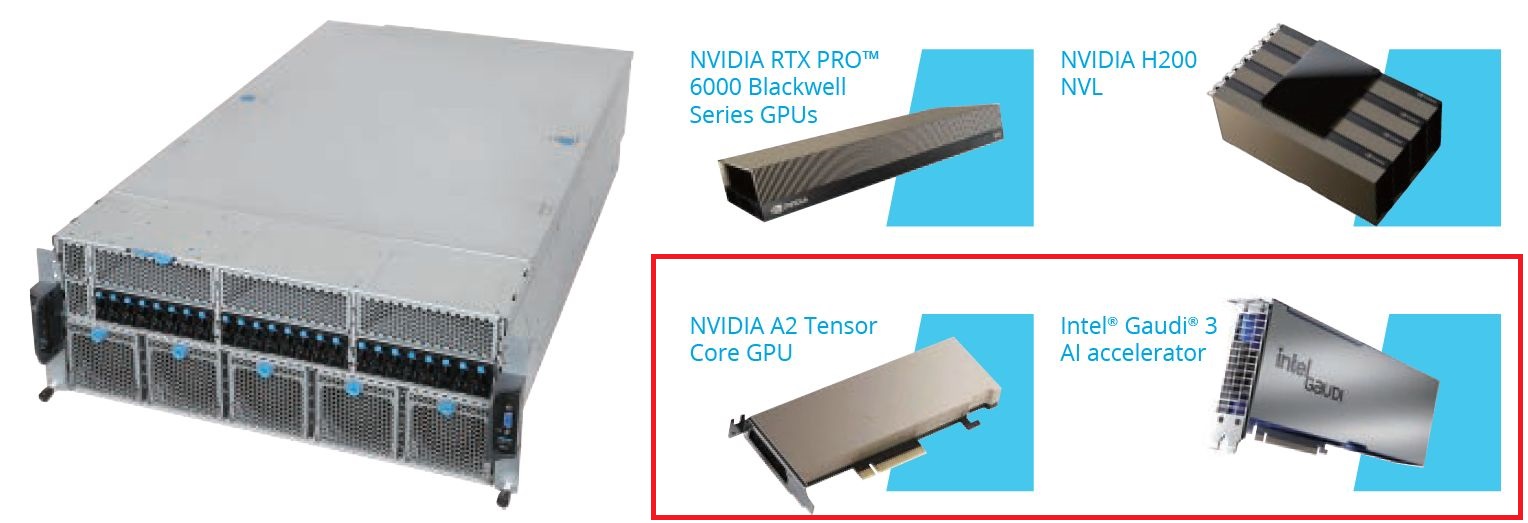 其他硬體規格的部分,D75E-4U搭配兩顆英特爾Xeon 6處理器,機箱背部能置入8張雙寬尺寸的GPU加速卡,以及5張單寬尺寸的網路卡(NIC)或BlueField-3資料處理器,因此,針對CPU、GPU、NIC的組態,提供兩種搭配:一是內建PCIe交換器,比例是2:8:5(2顆處理器搭配8張GPU與5張網路卡),另一是無PCIe交換器,三種元件搭配的比例是2:4:3;關於硬碟儲存的部分,機箱前側可安裝24臺E1.S外形的NVMe固態硬碟。