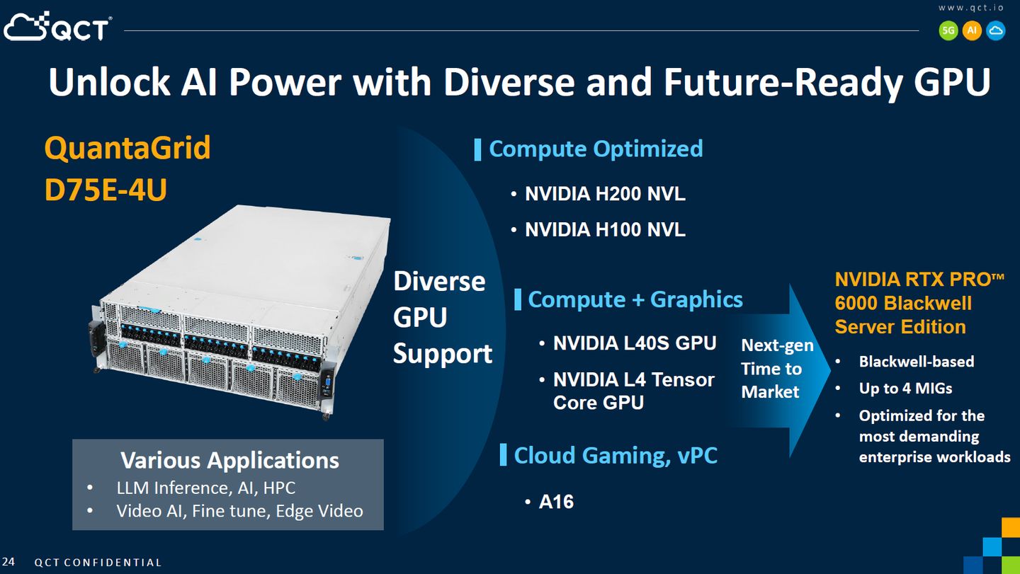 他們提供的RTX Pro伺服器產品QuantaGrid D75E-4U,最初是在今年3月GTC大會亮相,當時標榜的特色,就是支援RTX Pro 6000 Blackwell Server Edition,而在GTC大會的分場演講當中,他們透露更多關於這款伺服器的規格。