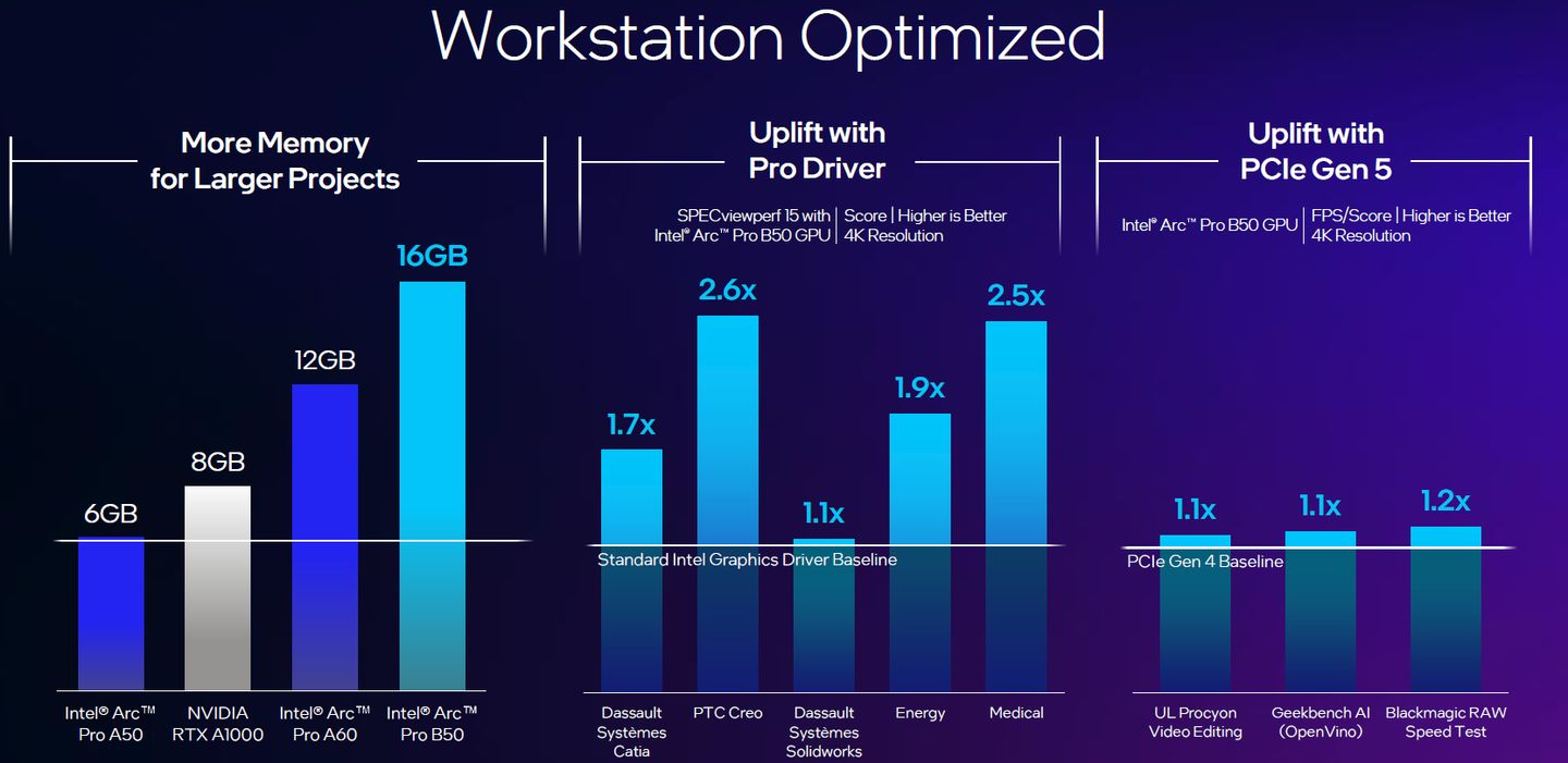 B50則是內建128個XMX指令集、16個光線追蹤單元、16個Xe2-HPG架構的核心、16 GB記憶體、記憶體頻寬224 GB/s,INT8整數運算效能最高170 TOPS,FP32浮點運算、單精度最高10.65 TFLOPS,熱設計功耗為70瓦,適合的工作負載類型,涵蓋2D與3D圖像設計與營建施工專案、AI推論類型的任務,以及2D影像與影片專案。