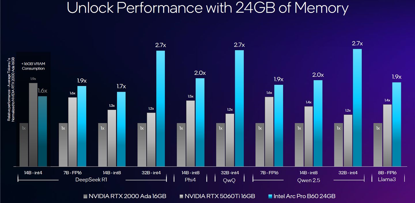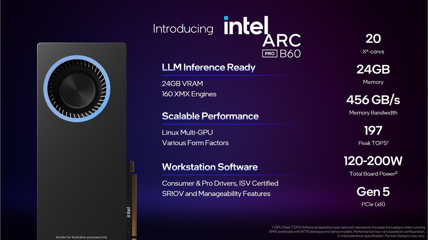 B60配備160個XMX指令集、20個光線追蹤單元、20個Xe2-HPG架構的核心、24 GB記憶體、記憶體頻寬456 GB/s,INT8整數運算效能最高197 TOPS,FP32浮點運算、單精度最高12.28 TFLOPS,熱設計功耗介於120瓦與200瓦,而且在Linux系統,可支援大型語言模型(LLM)的多張GPU處理模式,適合的應用方式,在於透過本機系統執行的LLM專案與軟體開發。