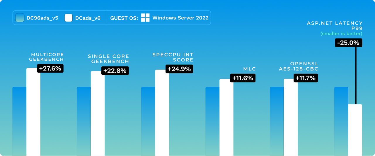 根據微軟內部測試結果,對比基於AMD第三代EPYC平臺的機密運算虛擬機器(DCasv5系列),新登場的DCasv6系列在多種項目當中,效能領先幅度達到25%。