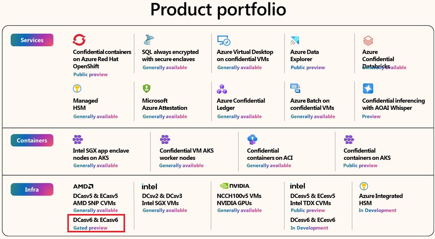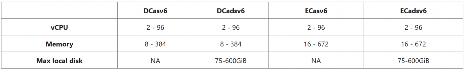 2至96顆vCPU、8至384 GiB記憶體、本機硬碟(DCasv6系列無,DCadsv6系列為75至3600 GiB)、8至64臺遠端儲存硬碟、網路介面2至8個(125000至34000 Mbps)